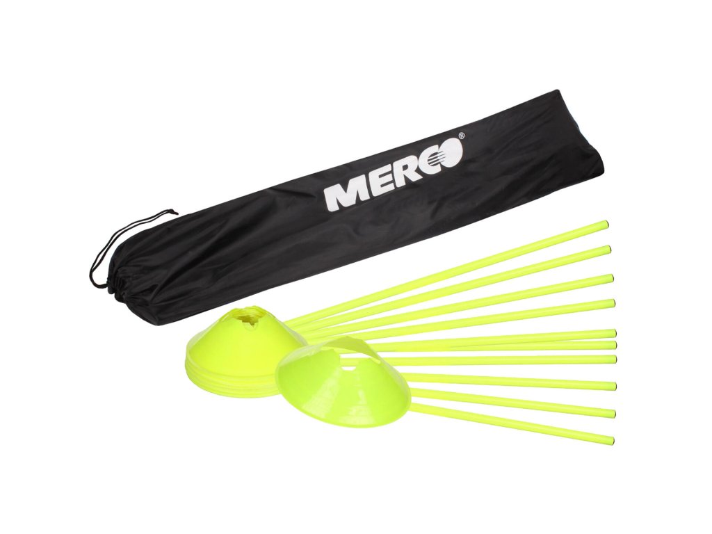 Obsahuje 10 lehkých PVC tyčí (délka 1 m) a 20 vytyčovacích met s otvorem, do kterého tyče jednoduše zasunete. Rychle tak postavíte překážky různých výšek – pro skoky, přeběhy i slalom. Díky odolné polyesterový vak vše snadno přenesete a uskladníte mezi tréninky.