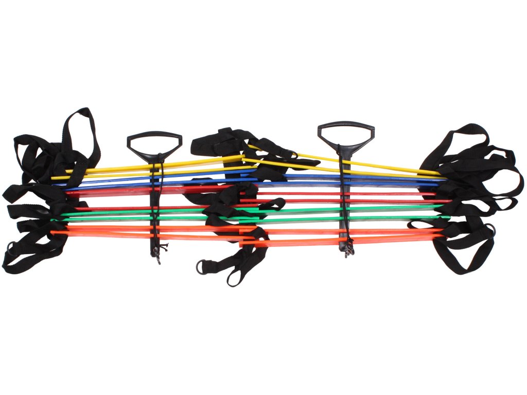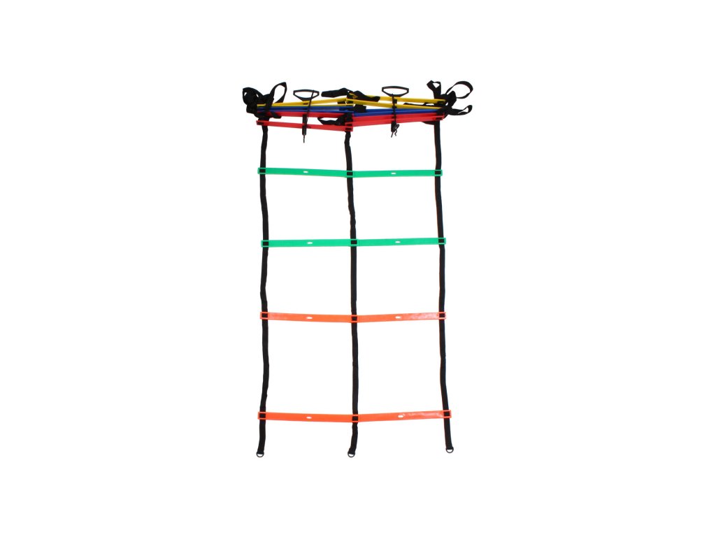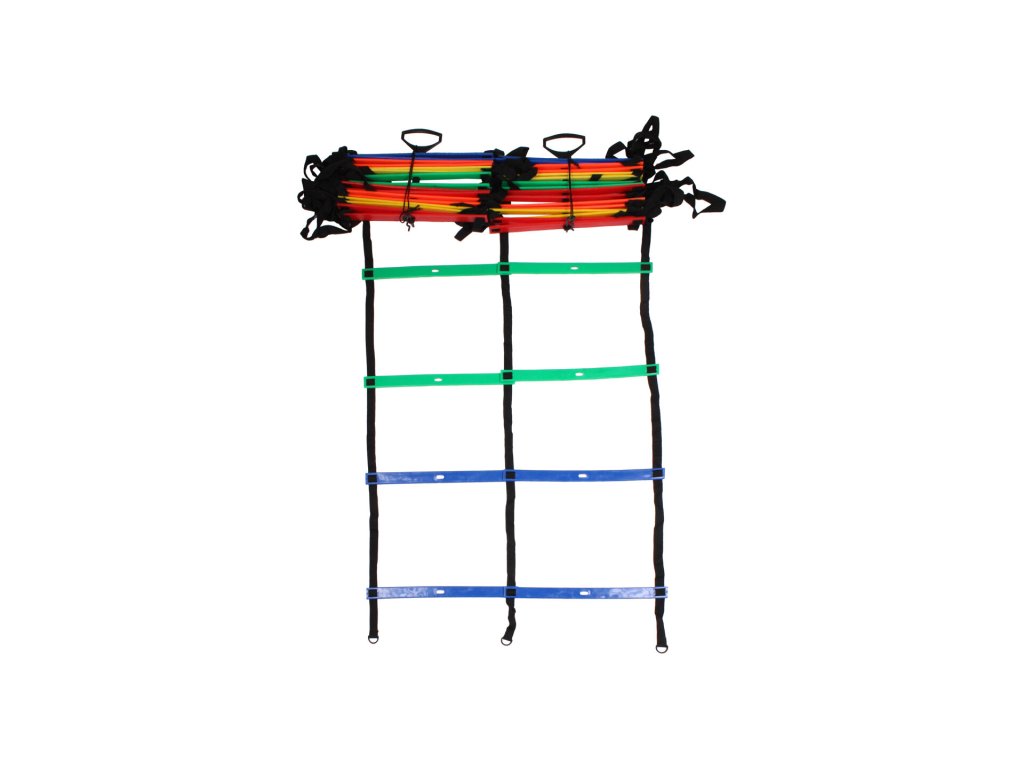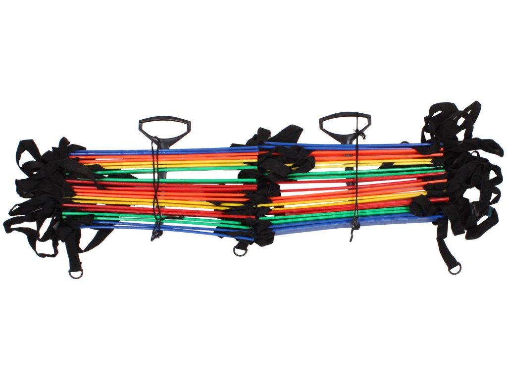 Dvouřadý agility žebřík Merco MultiColour Dual je tréninková pomůcka pro kondiční přípravu sportovců. Celkem 20 plastových příček u provedení 4,5m, nebo 40 plastových příček u provedení 9m lze snadno nastavit pro přizbůsobení vzdálenosti mezi jednotlivými příčkami podle potřeb a nápaditosti uživatele. Součástí agility žebříku Merco MultiColour Dual jsou madla, která se protahují středem příček a zabraňují zamotání žebříků + obal pro snadné uskladnění. U obou variant žebříku je šířka 43 cm.