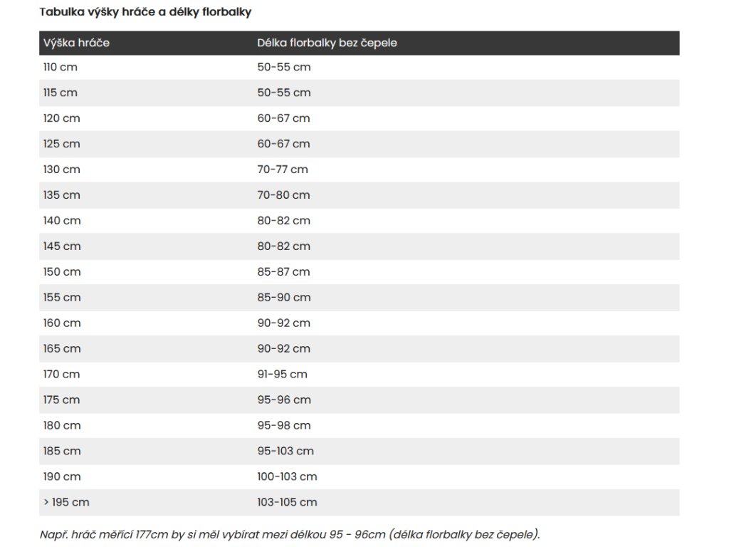 Důležitým bodem při výběru florbalky je správná délka hole. Zjednodušeně lze říci, že hokejka by měla sahat +- po pupík. (Tabulka výšky hráče a délky florbalky viz foto).
