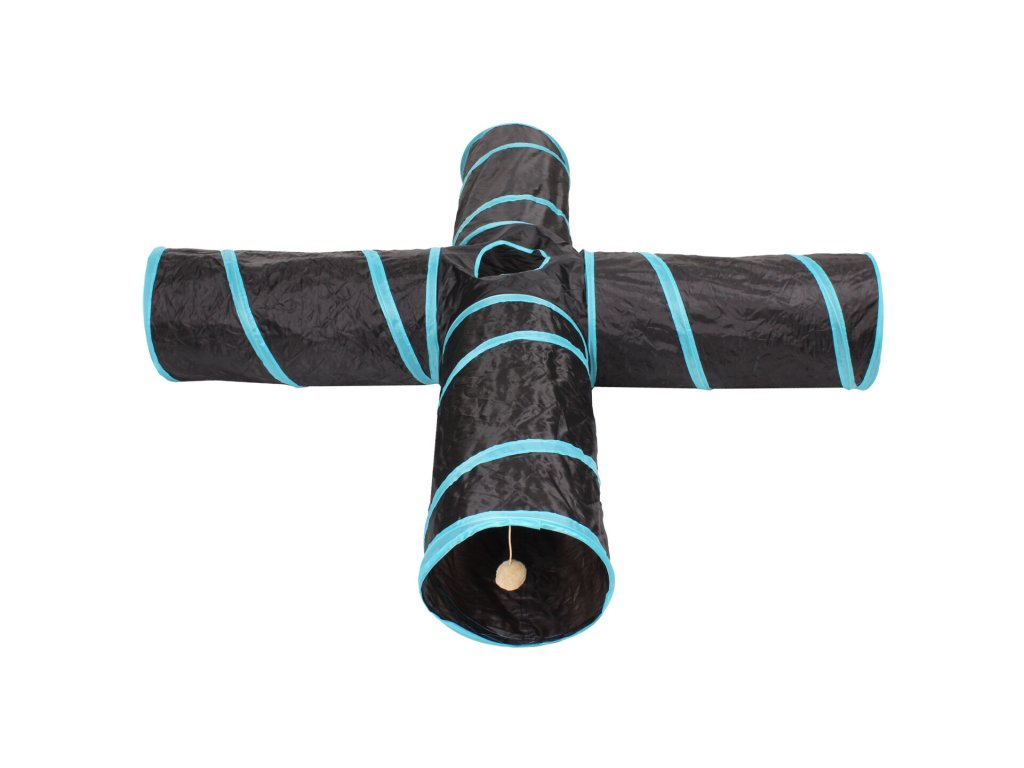 Tunel křížovitého tvaru má každý ze čtyř východů dlouhý 60 cm. Na jednom z konců je zavěšený plastový míček s rolničkou a na dalším z konců je plyšová bambulka. Ty slouží jako podnět ke hře zvláště pro kočičky.
