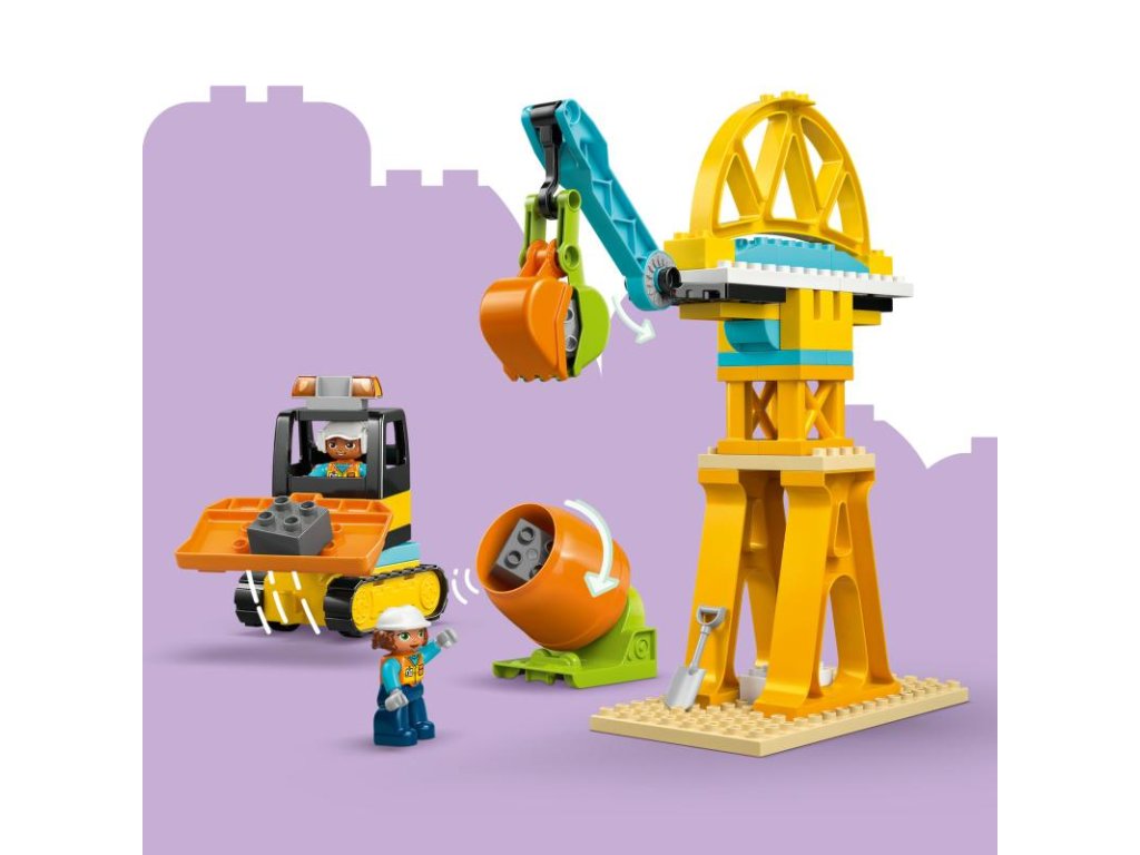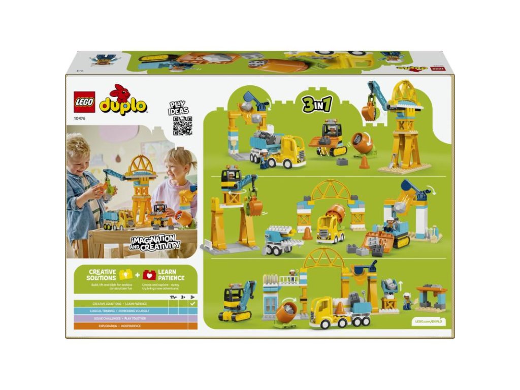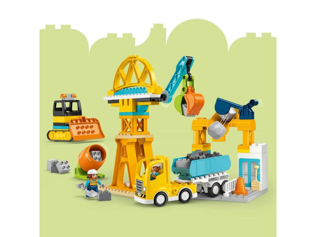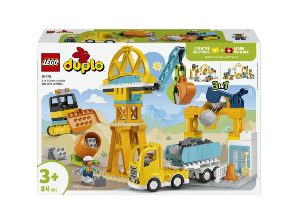Stavitelé od 3 let si užijí budou vtaženi do hry na rušném staveništi, kde si vyzkouší nakládání a vykládání materiálu, stejně jako zvedání a přemisťování kamení a kostek pomocí celé řady stavebních vozidel LEGO® DUPLO®. Děti si mohou postavit buldozer se zvedací lžicí, sklápěcí náklaďák, míchačku na beton s otočným bubnem a jeřáb s pohyblivým ramenem a otevíracím drapákem. Z kostek lze takésestavit vysoký jeřáb, nákladní stanici, přes kterou můžou projíždět náklaďáky, a most, pod kterým projíždějí vozidla. Malí stavitelé si se stavebnicí užijí hodiny zábavy, během kterých mohou rozvíjet důležité dovednosti. Děti, které milují řešení problémů, při stavění konstrukcí procvičí kritické myšlení. Dále mohou také rozvíjet orientaci v prostoru díky 2 figurkám dělníků, které pomocí zábavných funkcí nákladního auta přesouvají kostky po staveništi. Stavebnice obsahuje 84 dílků.