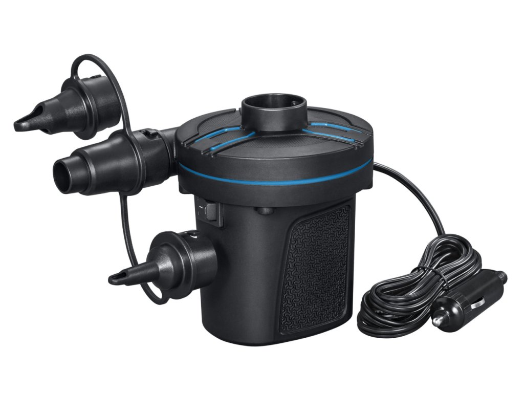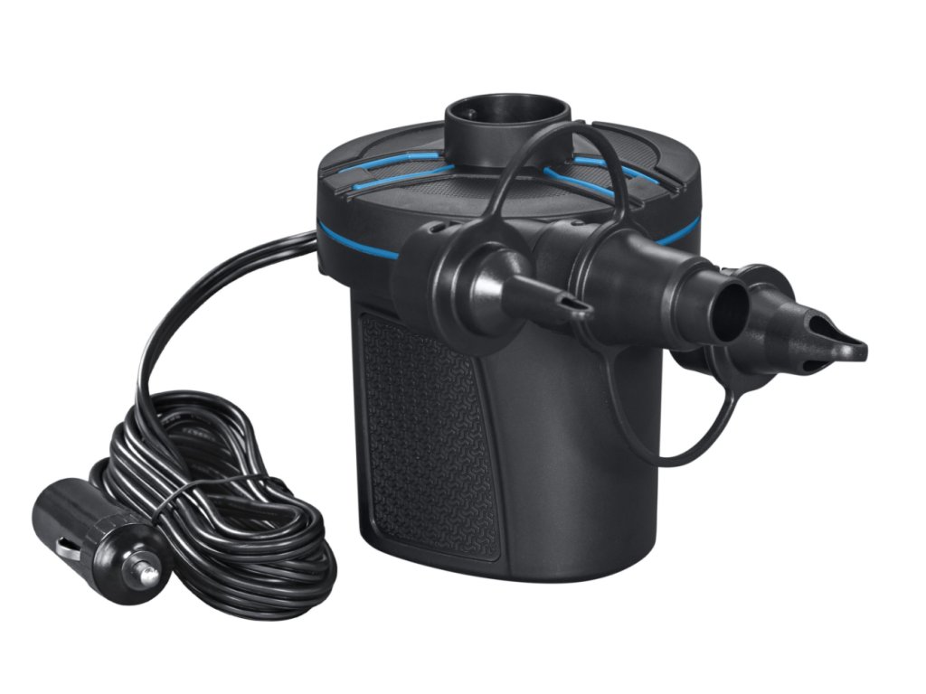Výkonná elektrická pumpa s DC motorem vhodná do domácnosti i na cesty. Pumpa pracuje pod napětím 12 V prostřednictvím adaptéru ze sítě. - na stejnosměrný proud o výkonu 96 W. Motor je možné napájet ve vozidlech z cigaretové zásuvky. Pumpa je vhodná pro použití při kempování i na domácí použití. Výkon je dostatečný pro nafukování větších výrobků - nafukovacích postelí, rekreačních člunů, rodinných lehátek, zahradních bazénů, nafukovacích matrací atd. . Protože se jedná o přenosné zařízení, je možnost využítí mnohem širší, a to i např. v čištění nepřístupných míst od prachu formou vyfukování. Pumpa také může sloužit jako vývěva - odsávání vzduchu. Pumpa má 3 nástavce o různém průměru umožňují se přizpůsobit různě velkým ventilům. Maximální doba nepřetržitého provozu je cca 10 minut, pak je potřeba dělat přestávku na vychladnutí motorku.