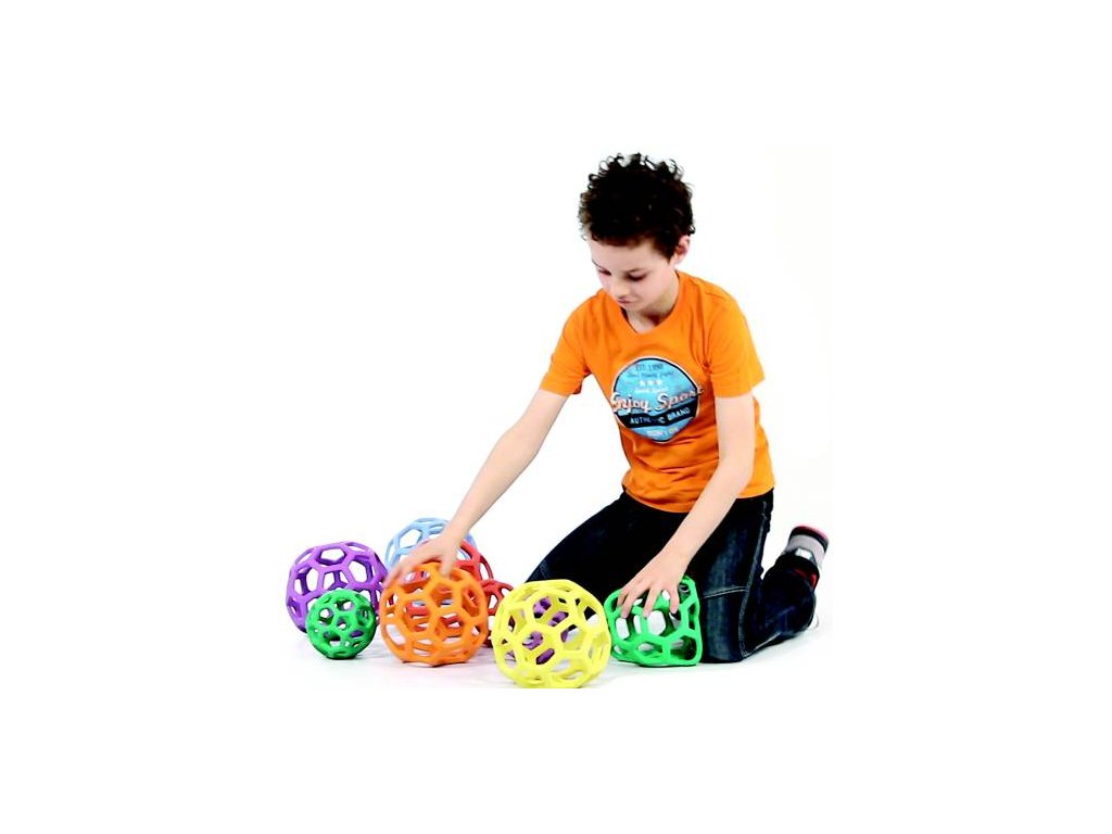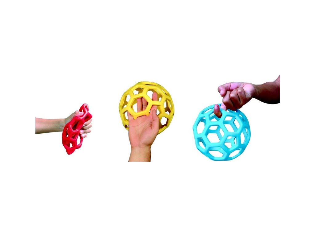 Díky praktickým otvorům můžete míček otáčet, stlačovat a manipulovat s ním různými způsoby, což skvěle procvičuje motoriku prstů i celé ruky.