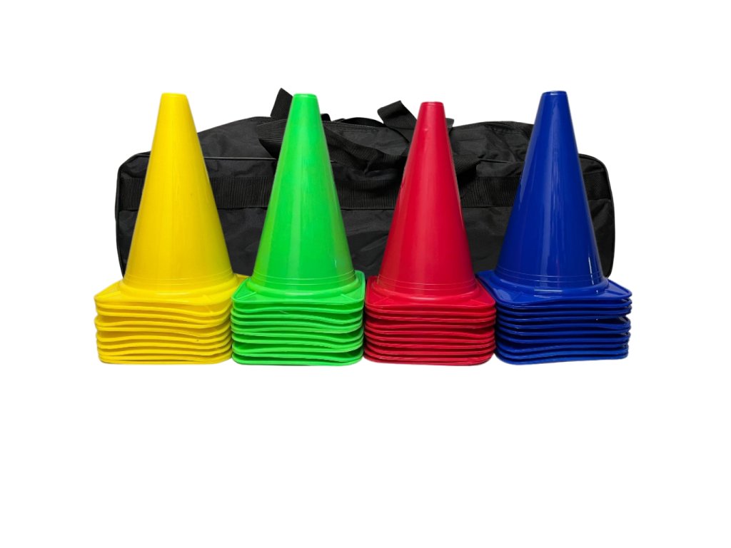 Tréninková sada obsahuje 40 kuželů o velikosti 23 cm, které jsou uloženy v praktické tašce.