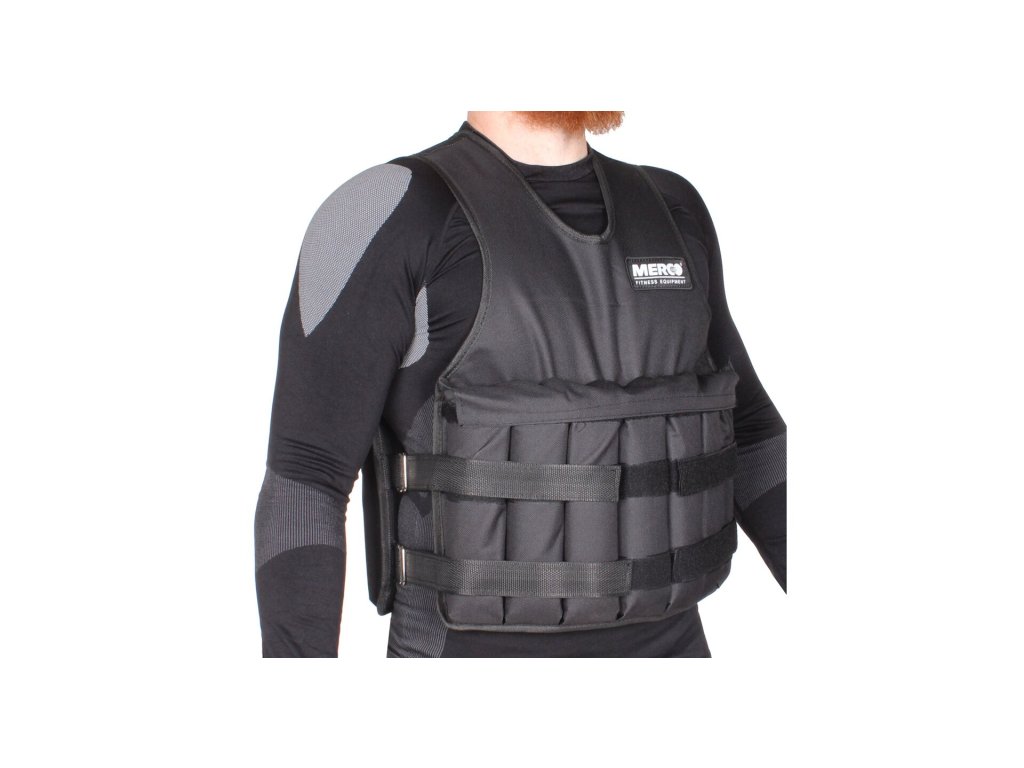 Zátěžová vesta v atraktivním designu je vyrobena ze speciální voděodolné tkaniny a k tělu se upevňuje pomocí dvou pásů se suchým zipem a dvojité ocelové přezky.