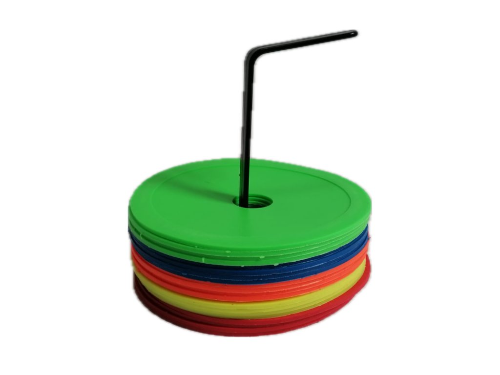 Sada šestnácti barevných vytyčovacích značek ve tvaru kruhu.